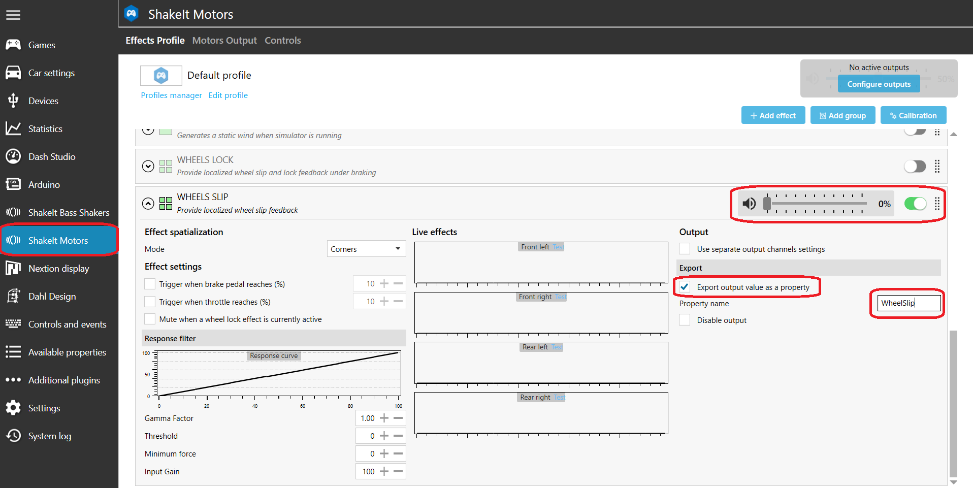 A special feature that requires a little extra setup is the **wheel slip properties.** These properties use the ShakeITMotorsV3Plugin to get slip values, then filters these values a bit.